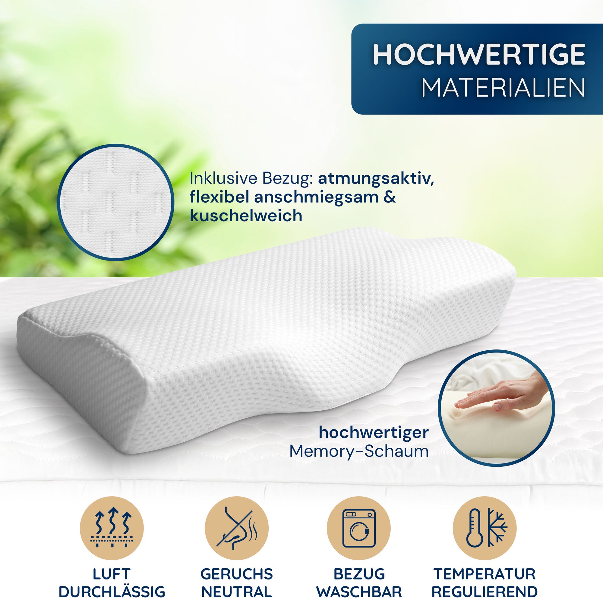 Alle Modelle bestehen aus hochwertigem Memory Schaum, der sich individuell an deine Kopfform anpasst. Je nach Modell ist ein Belüftungssystem oder temperaturregulierender Bezug enthalten.